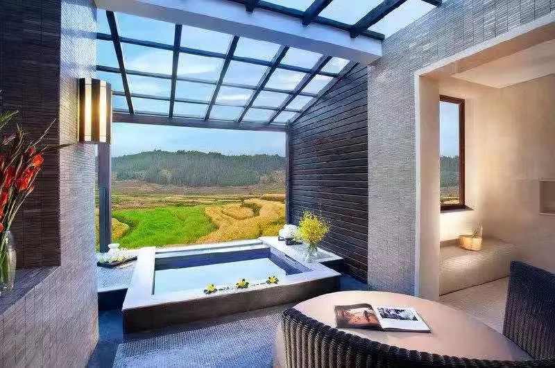 每个房间都有一个只属于你的温泉浴池,窗外就是翠绿色和金黄色田野交织的景色,泡个两小时都觉得还不够!