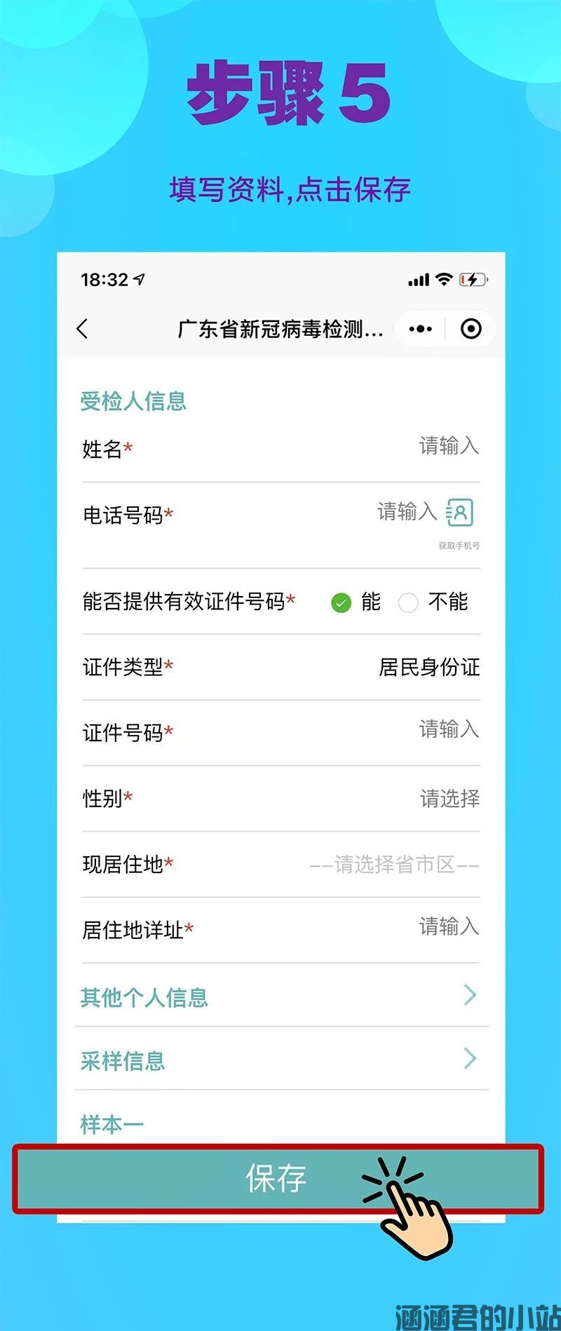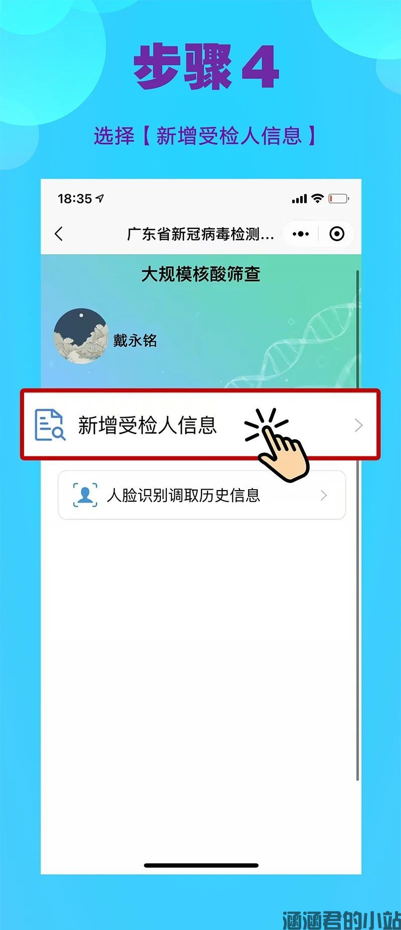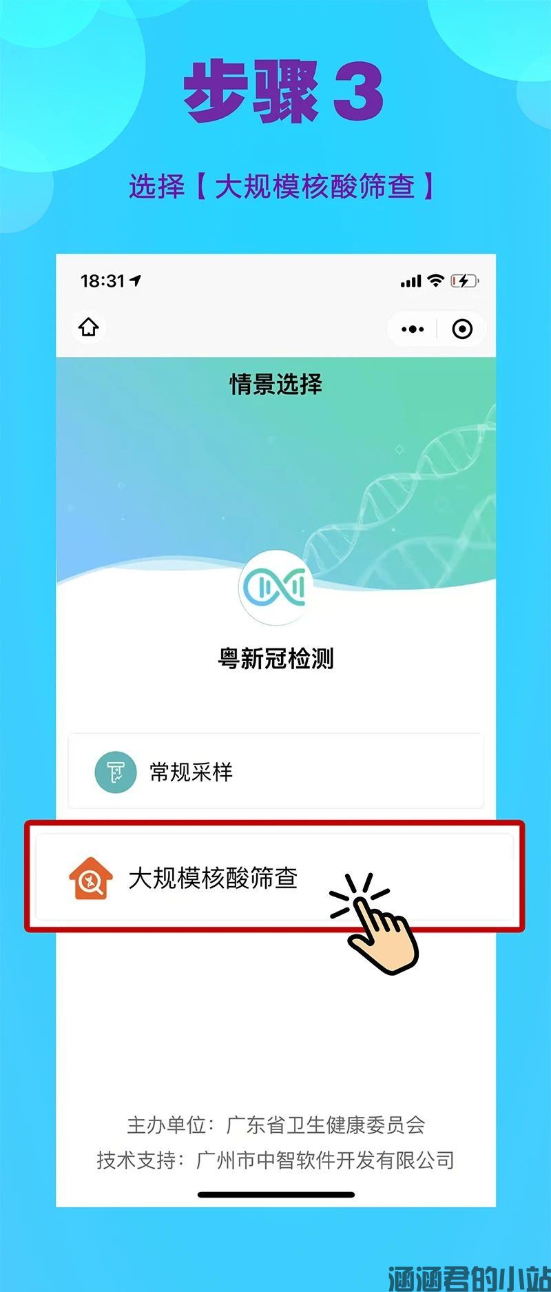 为做好核酸检测工作,请各位群众提前在微信里搜索“粤核酸”小程序,进入平台登记个人信息,老人,孩子可由家人代为登记。