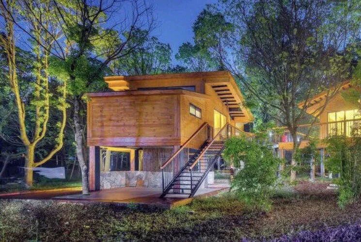 玻璃浴室里,抬头可见参天大树,夜晚躺在浴缸里,头上有漫天繁星。